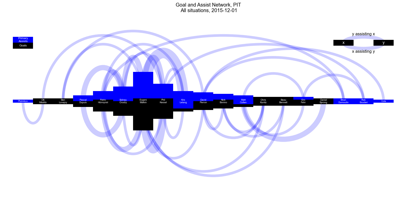 Для поклонников "Питтсбурга" и Евгения Малкина приведу визуализацию статистики, демонстирующую взаимодействие результативных игроков команды по состоянию на 6.12.15: