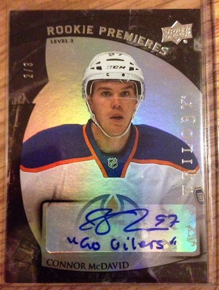 А вот и Коннор! Параллельная версия его автографа из коллекции UD Trilogy с призывом "Go Oilers" тиражом 3 экз. была оценена более чем в три с половиной тысячи долларов.