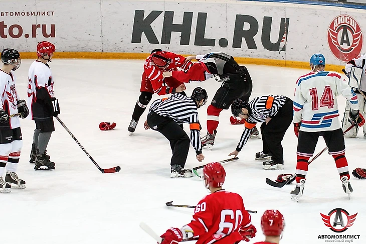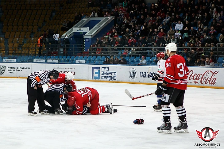 Одним из самых запоминающихся событий вечера стало нападение Андрея Разина (который, к слову, махнулся ролями с Анатолием Голышевым) на арбитра. Главный судья не с первого раза, но все-таки повалился на лед: