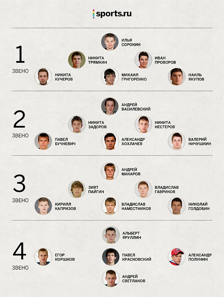 Звено Полунин – Красковский – Коршков даже не может восприниматься как три разных хоккеиста, именно так – трехглавное шестирукое клюшкастое чудище. На МЧМ ярославские молодцы взяли на себя лидерство, пока у номинально первого звена были определенные проблемы. Звездный час – полуфинал с США, когда сначала гол был забит после хитрой комбинации, а потом Коршков, который благодаря такой игре заметно поднялся в рейтинге драфта-2016, как приклеенную завез шайбу мимо нескольких американских защитников.