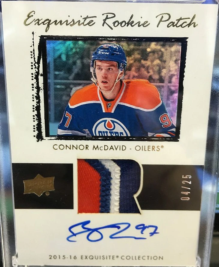 1) И на первом месте (в этом никто и не сомневался) Коннор МакДэвид с картой из недавно вышедшего (и внимательно рассмотренного в этом блоге) Upper Deck Ice 2015-16. Карта из подсерии Rookie Autograph Patch Tribute была продана за 8000$.