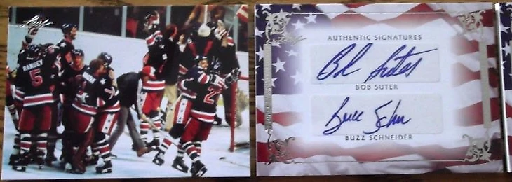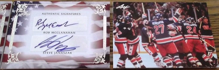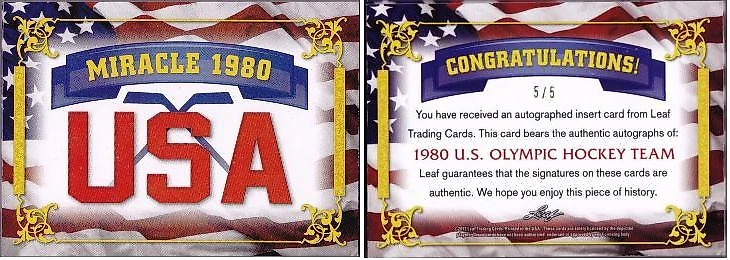 С картами не новичков в мае всё было очень печально. Только одна карточка перевалила за 1000$. Если это можно назвать карточкой. Поэтому, вместо того, чтобы ранжировать «копеечные» карты, давайте рассмотрим внимательнее чудо, вышедшее из-под печатного станка компании Leaf. Эта фирма не имеет лицензии от НХЛ, поэтому выкручивается как может. Например, выпускает карты сборной США. В коллекцию 2012 Leaf Legends of Sport был вложен мега буклет с 16 автографами игроков Олимпийской сборной образца 1980 года. Выглядело это примерно так: