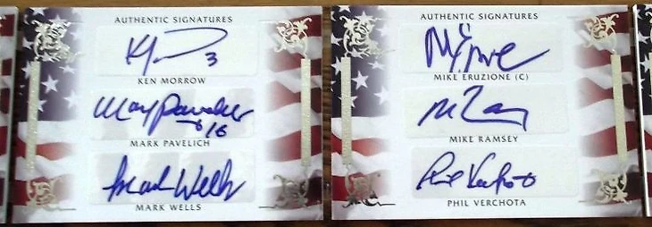 Надо сказать, что по сути, это несколько скрепленных между собой карточек, причем, чуть ли не толстым скотчем скрепленных. Тем не менее, за такой буклет тиражом 5 экз. было заплачено 1900$. Интересно, если кто-нибудь вдруг выпустит буклет с автографами игроков сборной СССР, проигравших этой команде, то какова будет его цена?