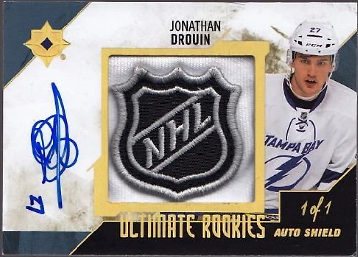 4) На четвертом месте в этой номинации Джонатан Друэн и его шильд из 2014-15 UD Ultimate, 1/1 разумеется. Цена этой карты 3200$
