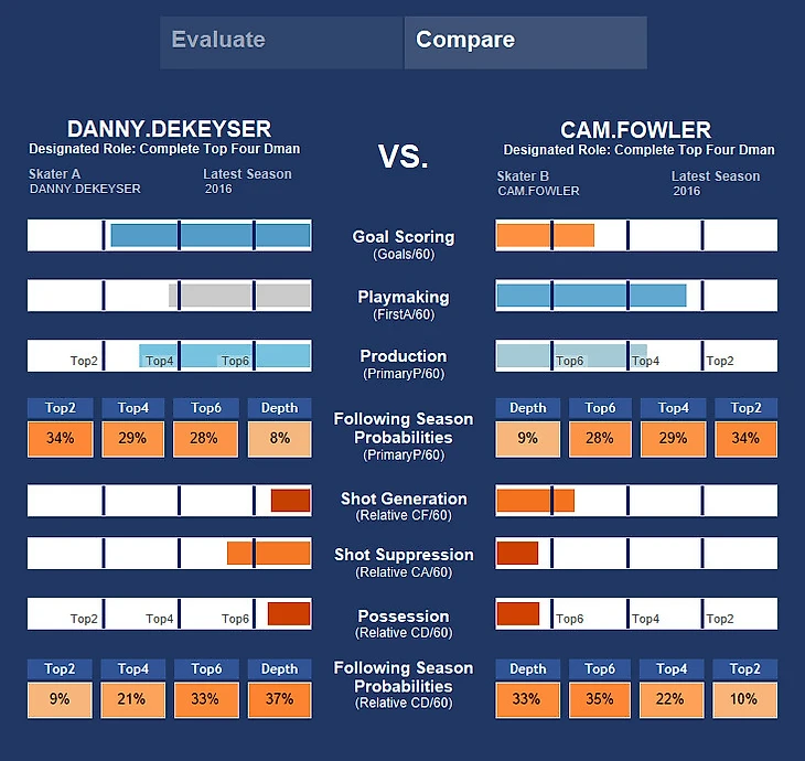 Несмотря на довольно схожую продуктивность, более высокий FirstA/60 и Relative CF/60 говорит о том, что Фаулер более хорош в обостряющих передачах на партнеров в чужой зоне (что не мешает проводить много времени на льду с такими, как Кори Перри и Райан Гецлаф, вместо Даррена Хелма и Люка Гленденинга). В довершении всего, он проводит в среднем 20+ минут на льду с момента прихода в лигу 6 лет назад, когда ему было всего 19 лет.