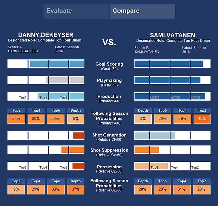 В первую очередь, контракт Сами Ватанена устанавливает планку для "Детроита" и Дэнни ДеКайзера, которому предстоит подписать новый контракт в это межсезонье. Ватанен и ДеКайзер практически одного возраста (25 и 26 лет, соответственно), но на этом все их сходства и заканчиваются. О чем можно судить по сравнительным диаграммам обоих игроков.