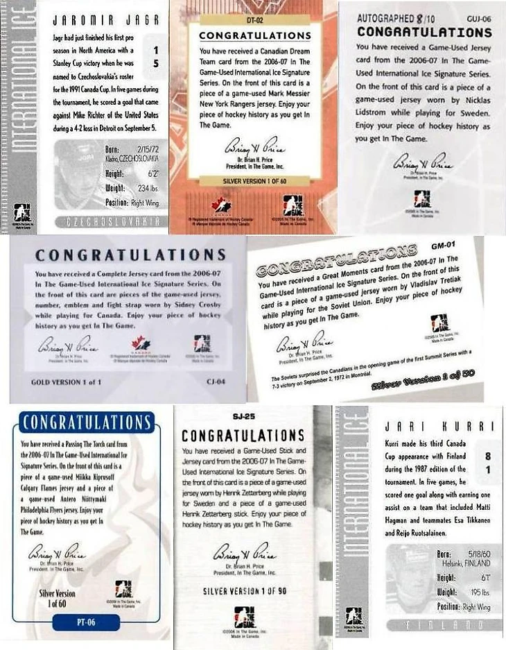 Представлены карты игроков в форме национальных команд своих стран. Всего в коллекции есть хоккеисты семи стран: Канада, СССР/Россия, Чехословакия/Чехия, США, Швеция, Финляндия, Франция. При этом делается привязка игрока к различным значимым событиям от Суперсерии-72 до Олимпийских игр и Молодежного чемпионата мира 2006. Год, когда произошло событие (и чаще всего сделано фото) указывается на карте. А многие игроки, принимавшие участие более чем в одном из таких событий, представлены несколькими картами.