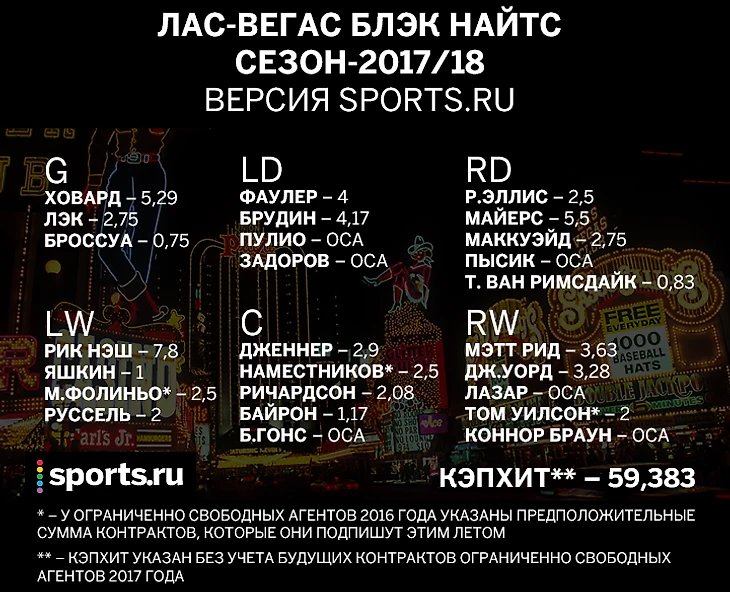 Понятно, что этот состав не готов биться за плей-офф с первого сезона. Да и со второго, скорее всего, тоже. Потому что топ-6 в нападении — это, по сути, заплатка, чтобы как-то перебиться. Но как площадка для создания сильной команды, кажется, выглядит неплохо. Тем более будет еще и драфт новичков, на котором «Лас-Вегас» получит высокий выбор. Так или иначе наша симуляция вполне отражает те проблемы, с которыми столкнутся реальные менеджеры «Лас-Вегаса» – в первую очередь, крайне скромный выбор нападающих, особенно центральных.