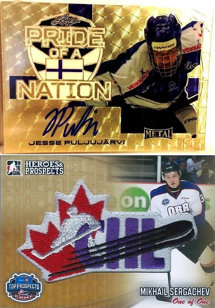 И еще 2 карты от Leaf. На втором месте Ессе Пюлюярви нападающий финского Кярпят, чемпион мира в составе сборных до 18 и до 20 лет, выбранный Эдмонтоном под 4-м номером. Здесь есть не только автограф и тираж 1/1, но и отличный дизайн самой карты. И достаточно неожиданно на первом месте оказывается защитник Виндзор Спитфайрс Михаил Сергачев отправившийся в Монреаль 9-м по счету. Тут решают шильд CHL и больной хоккеем Монреаль.
