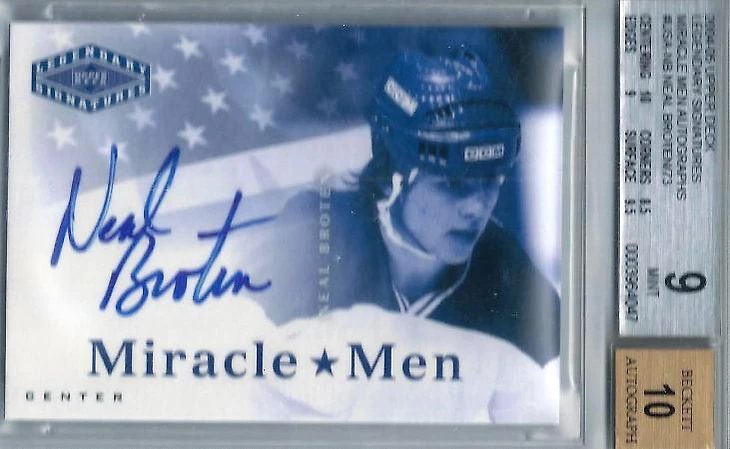 1) Ну и на первом месте, как и месяц назад, карта, имеющая отношение к Чуду на льду. На этот раз, это персональная карта олимпийского чемпиона 1980 года, обладателя Кубка Стэнли и легенды Миннесоты Нила Бротена из коллекции 2004-05 LegendarySignatures подсерия AutoMiracle оценена в 9 баллов, а автограф на ней – на десятку. Цена 1125$. Тираж 73 экз.