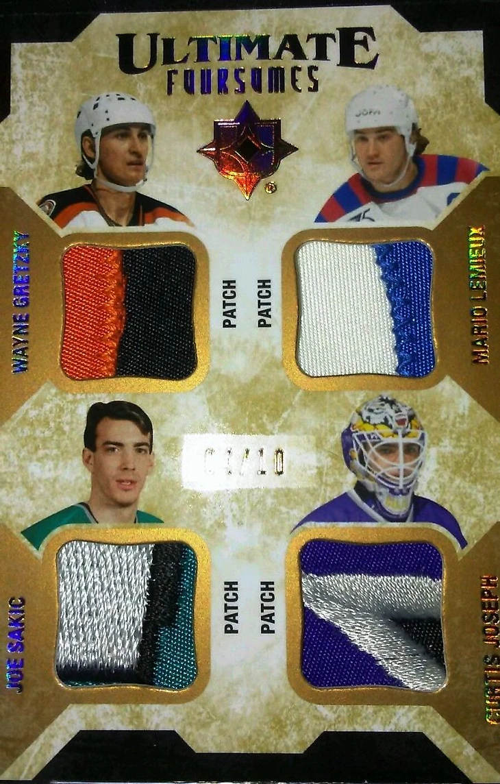 3) На третьем месте сразу 4 звезды. Патч из коллекции 2015 UD Ultimate Грецки-Лемье-Сакик-Джозеф с отличными кусками и тиражом 10 экз. был продан почти за 1000$. Точнее за 996,66$