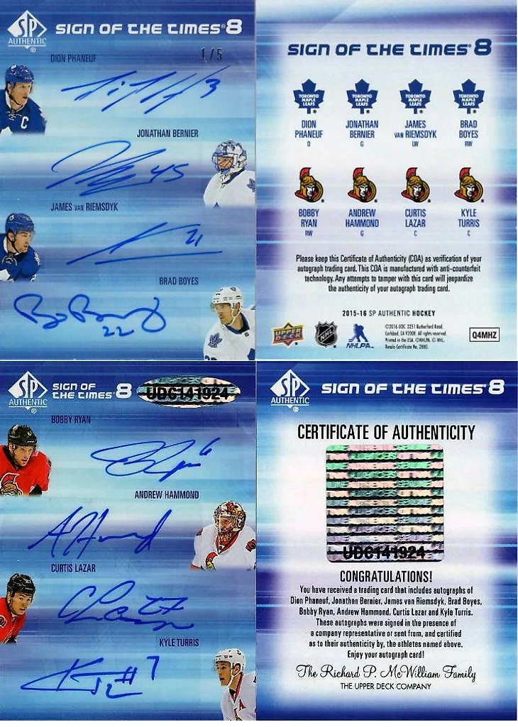 Карты с автографами 8 игроков состоят из 2 частей. На первой с 2 сторон помещено по 4 автографа, а на второй - на лицевой стороне информация о карте, как на обороте обычной карты, а с другой стороны сертификат подлинности карты. Выглядит это так: