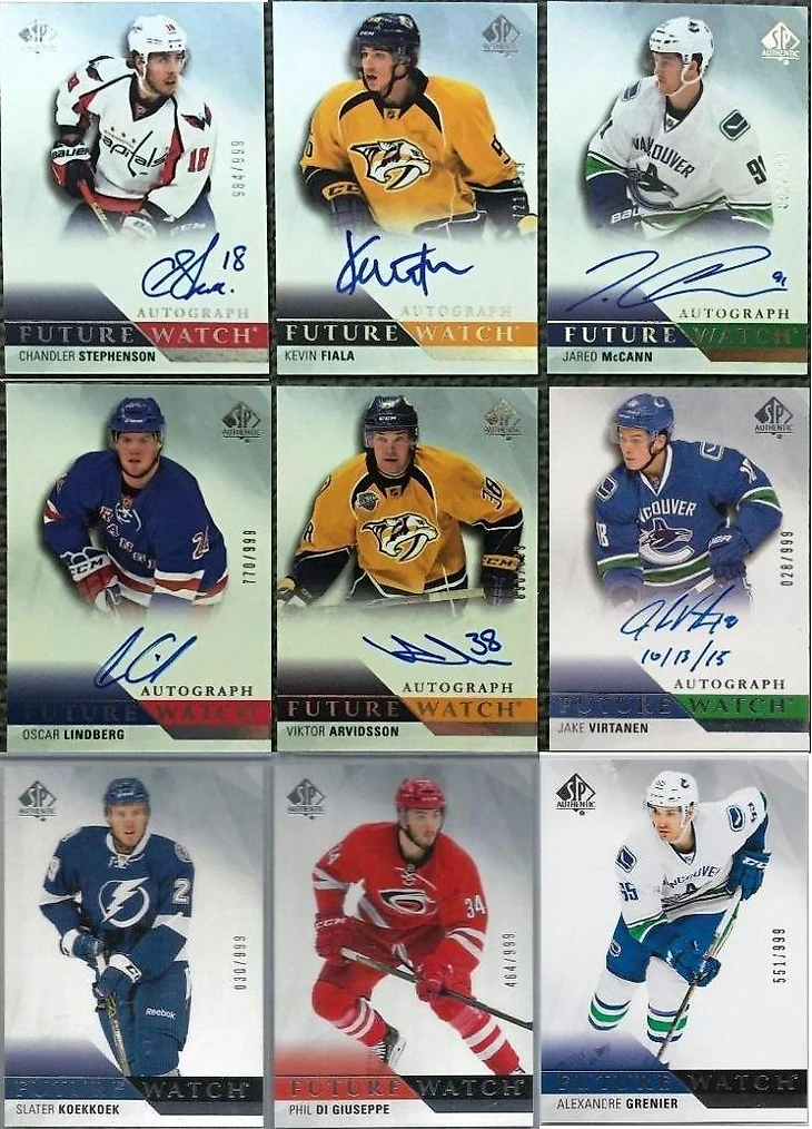 Future Watch Autographs. 60 карт (№ 226-285) тираж каждой карты 999 экз. Главные новички сезона, автографы проставлены непосредственно на картах. Никаких сокращенных тиражей - все карты выпускаются в одинаковом количестве. Это делает подсерию одной из самых популярных в хобби-хоккее. На блок гарантируется 1 карта.