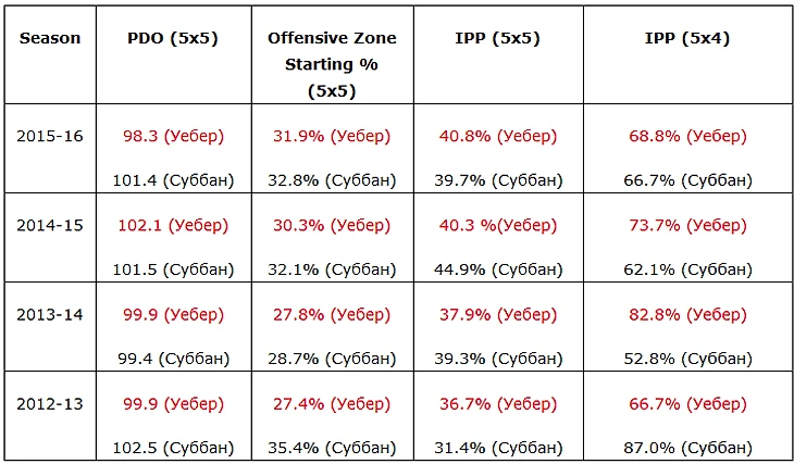 Уебер имеет стандартные показатели PDO (процент реализации бросков (shooting percentage) + процент сэйвов (save percentage)), только в сезоне 14/15 ему везло больше обычного (102,1 - если показатель больше ста, то это говорит об удачливости игрока). Суббан в 3 из 4 последних сезонов имеет PDO больше 100, что говорит о его «везучести». Из этого можно сделать вывод, что показатели Суббана в этих сезонах несколько завышены, т.к имел фактор везения.