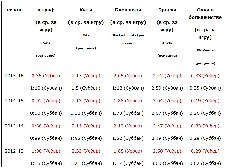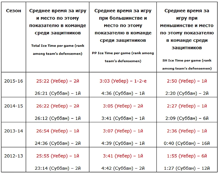 По количеству проводимого времени и Уебер, и Суббан являются лидерами своих команд. Суббан за последние 2 года поднялся на первое место в «Монреале» по среднему количеству времени, проведенном на площадке за игру. Количественно его показатель вырос с 23:14 в сезоне 2012/13, до 26:21 – в 2015/16, что характерезует Суббана как игрока прогрессирующего. Уебер в последних двух сезонах уступает по этому показателю своему напарнику Роману Йоси, который, по мнению некоторых, перерос Ши Уебера.