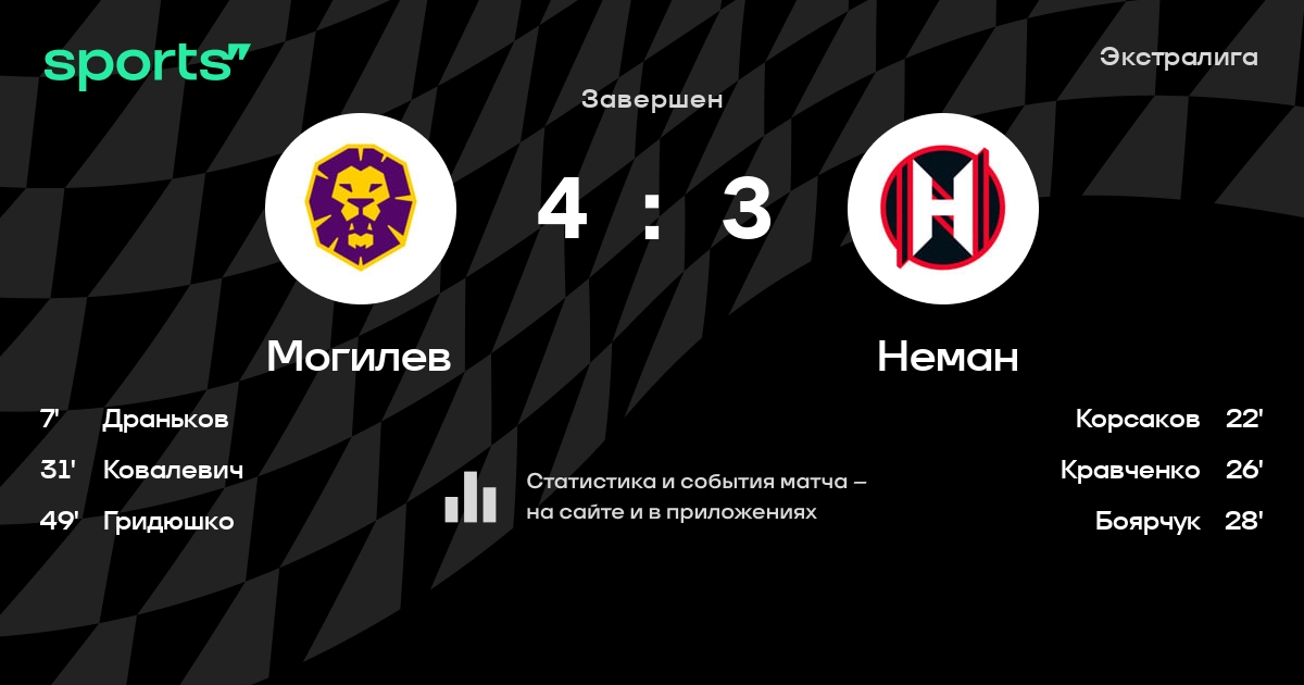 В прошедшем матче в рамках турнира Экстралига состоялась встреча команд Могилев - Неман в городе Могилев (Беларусь) на стадионе Ледовый дворец спорта Могилев (вместимость - 3048)