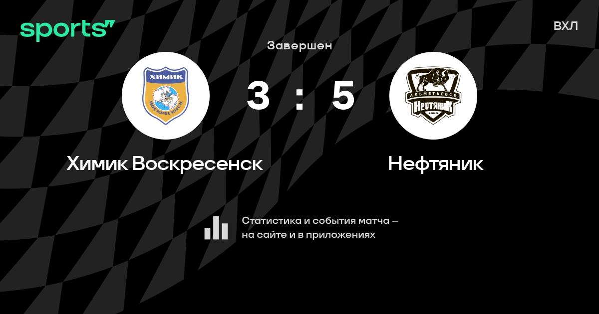 В прошедшем матче в рамках турнира ВХЛ состоялась встреча команд Химик Воскресенск - Нефтяник со счетом 3 : 5.