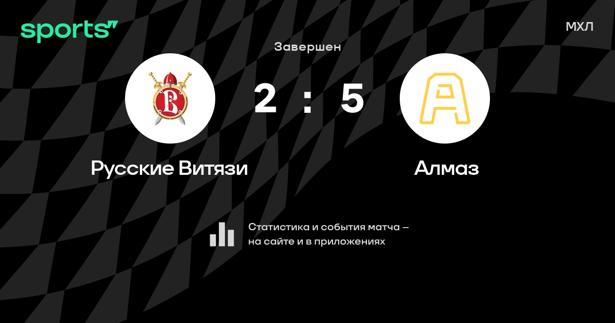 В прошедшем матче в рамках турнира МХЛ состоялась встреча команд Русские Витязи - Алмаз со счетом 2 : 5.