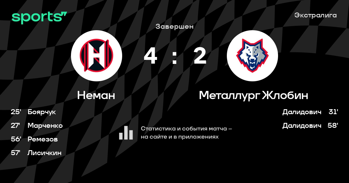 В прошедшем матче в рамках турнира Экстралига состоялась встреча команд Неман - Металлург Жлобин со счетом 4 : 2.