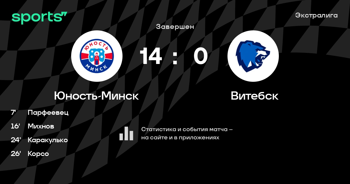 В прошедшем матче в рамках турнира Экстралига состоялась встреча команд Юность-Минск - Витебск в городе Minsk на стадионе Yunost Minsk Arena со счетом 14 : 0.
