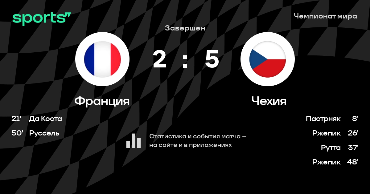 В прошедшем матче в рамках турнира Чемпионат мира Группа B состоялась встреча команд Франция - Чехия в городе Париж (Франция) на стадионе Аккор Арена (вместимость - 15609)