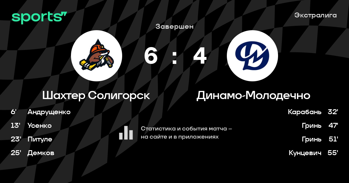 В прошедшем матче в рамках турнира Экстралига состоялась встреча команд Шахтер Солигорск - Динамо-Молодечно в городе Солигорск (Беларусь) на стадионе Ледовый дворец спорта Солигорск (вместимость - 1800)