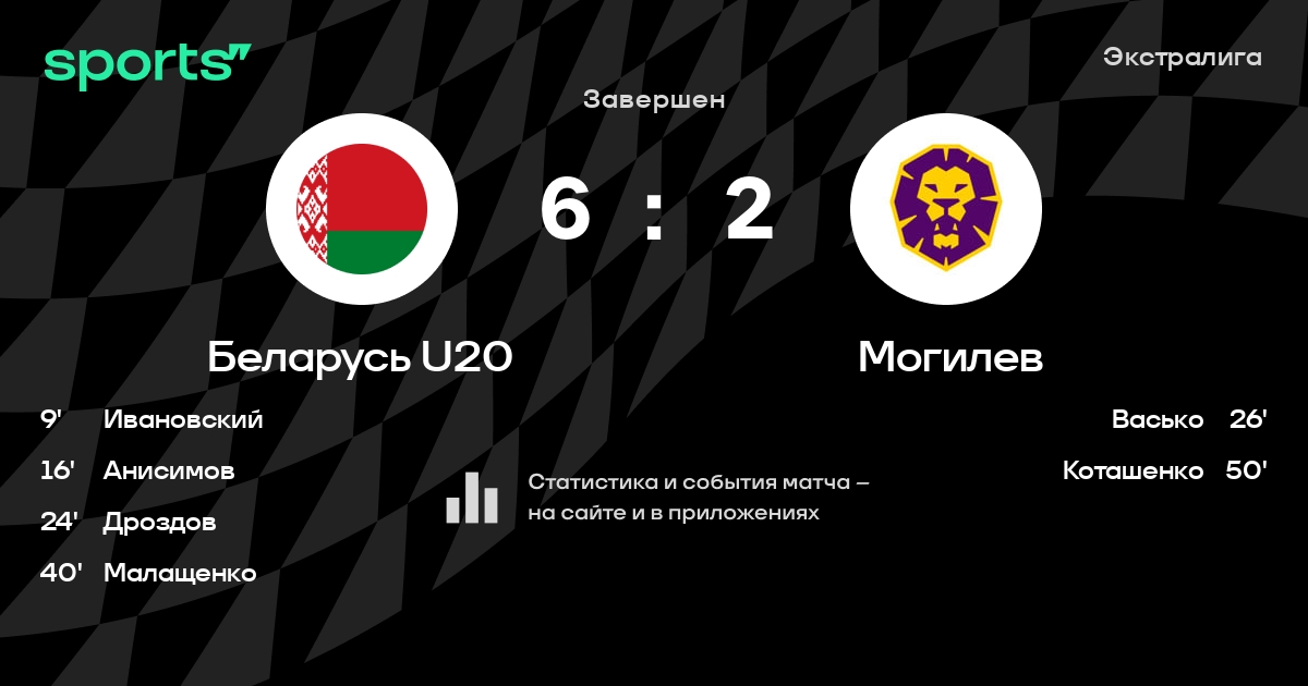 В прошедшем матче в рамках турнира Экстралига состоялась встреча команд Беларусь U20 - Могилев в городе Минск (Беларусь) на стадионе Чижовка-Арена (вместимость - 9487)