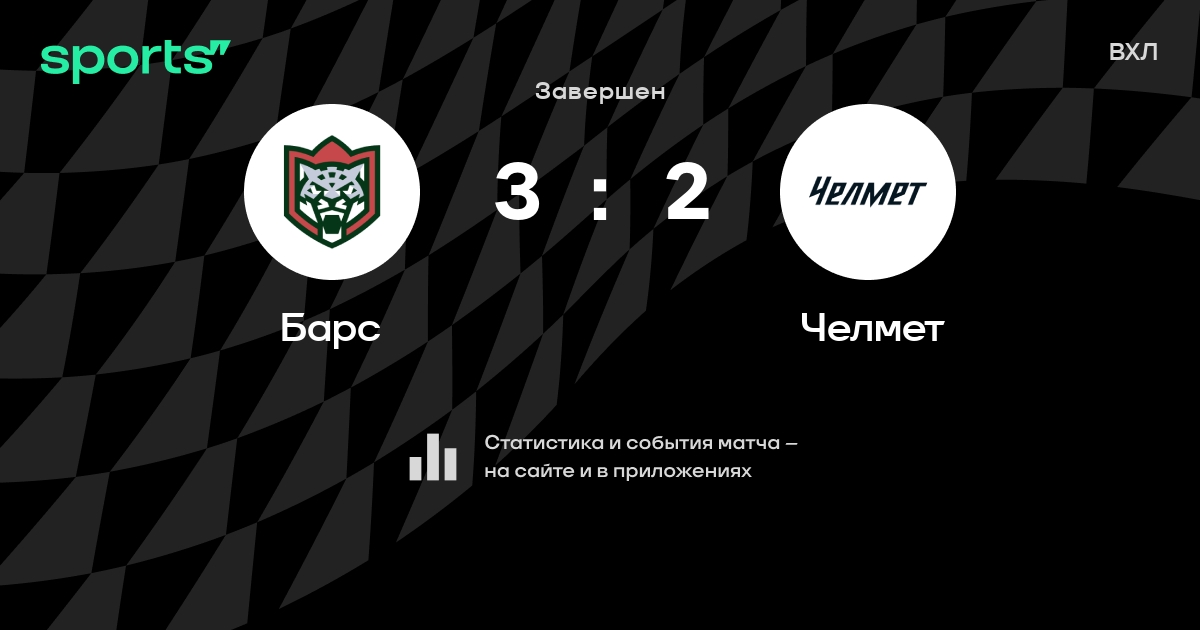 В прошедшем матче в рамках турнира ВХЛ состоялась встреча команд Барс - Челмет со счетом 3 : 2.