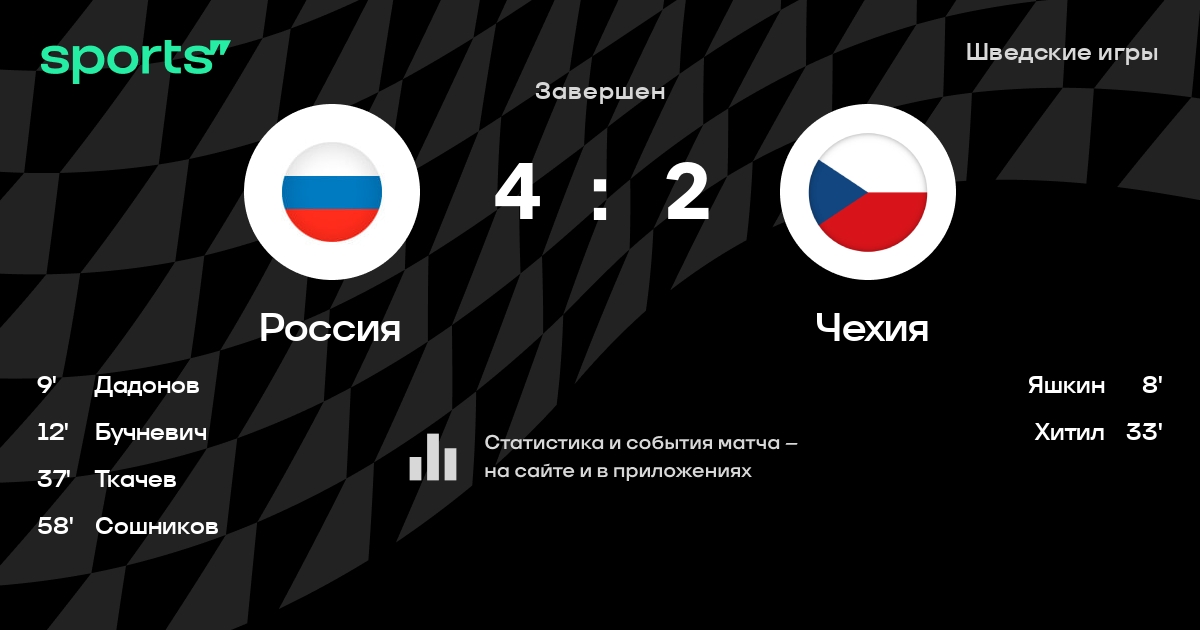 В прошедшем матче в рамках турнира Шведские игры состоялась встреча команд Россия - Чехия в городе Stockholm на стадионе Hovet со счетом 4 : 2.
