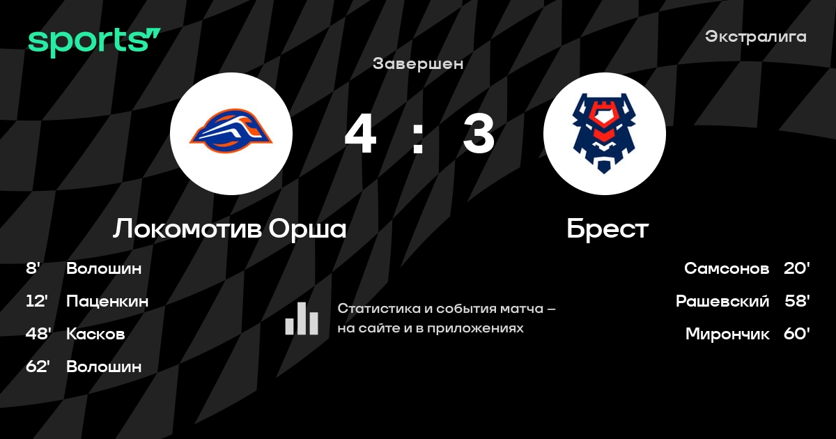В прошедшем матче в рамках турнира Экстралига состоялась встреча команд Локомотив Орша - Брест в городе Орша (Беларусь) на стадионе Ледовая арена Орша (вместимость - 3500)
