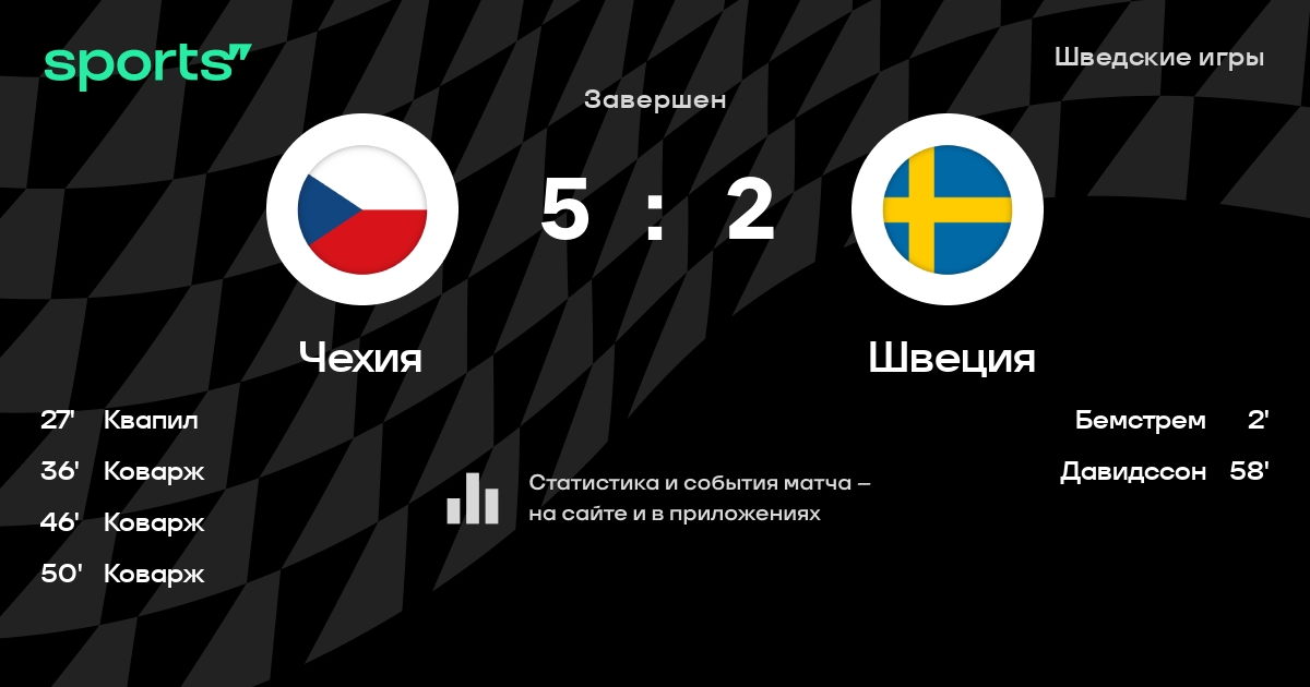 В прошедшем матче в рамках турнира Шведские игры состоялась встреча команд Чехия - Швеция в городе Stockholm на стадионе Hovet со счетом 5 : 2.