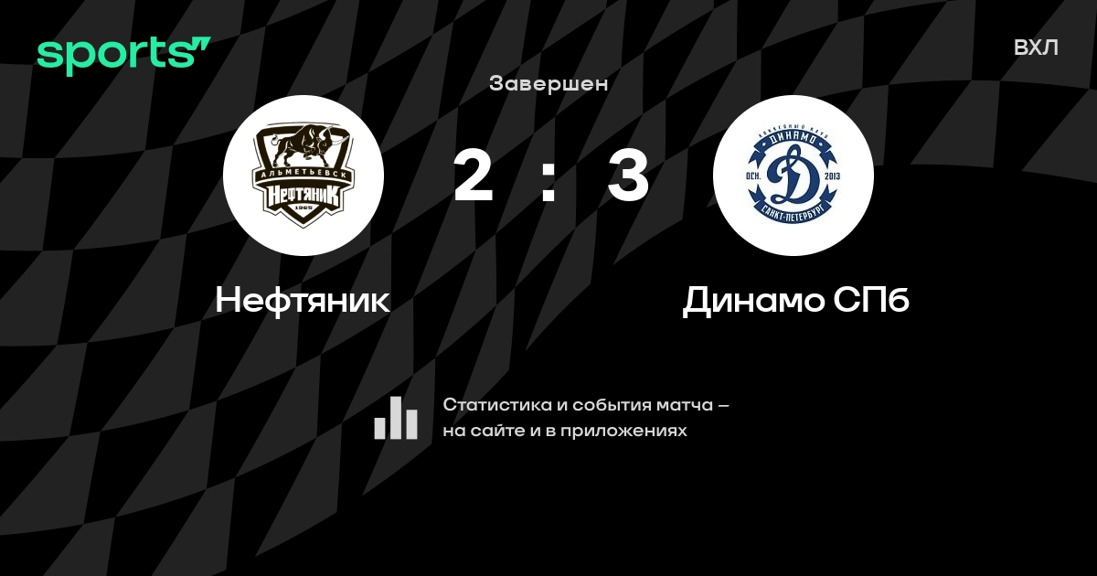 В прошедшем матче в рамках турнира ВХЛ состоялась встреча команд Нефтяник - Динамо СПб со счетом 2 : 3.