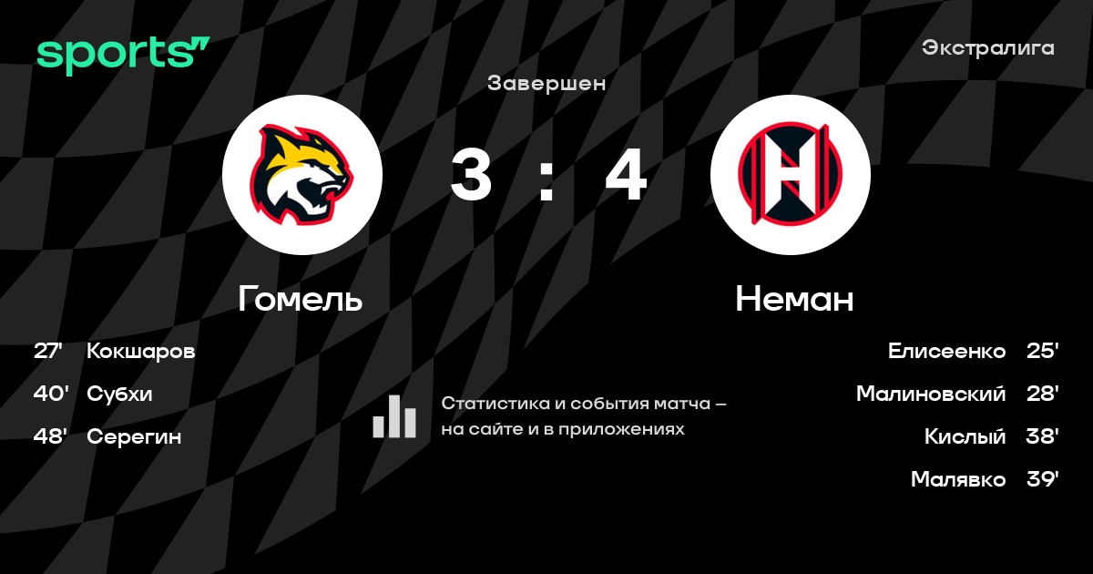 В прошедшем матче в рамках турнира Экстралига состоялась встреча команд Гомель - Неман в городе Гомель (Беларусь) на стадионе Ледовый дворец Гомель (вместимость - 2700)