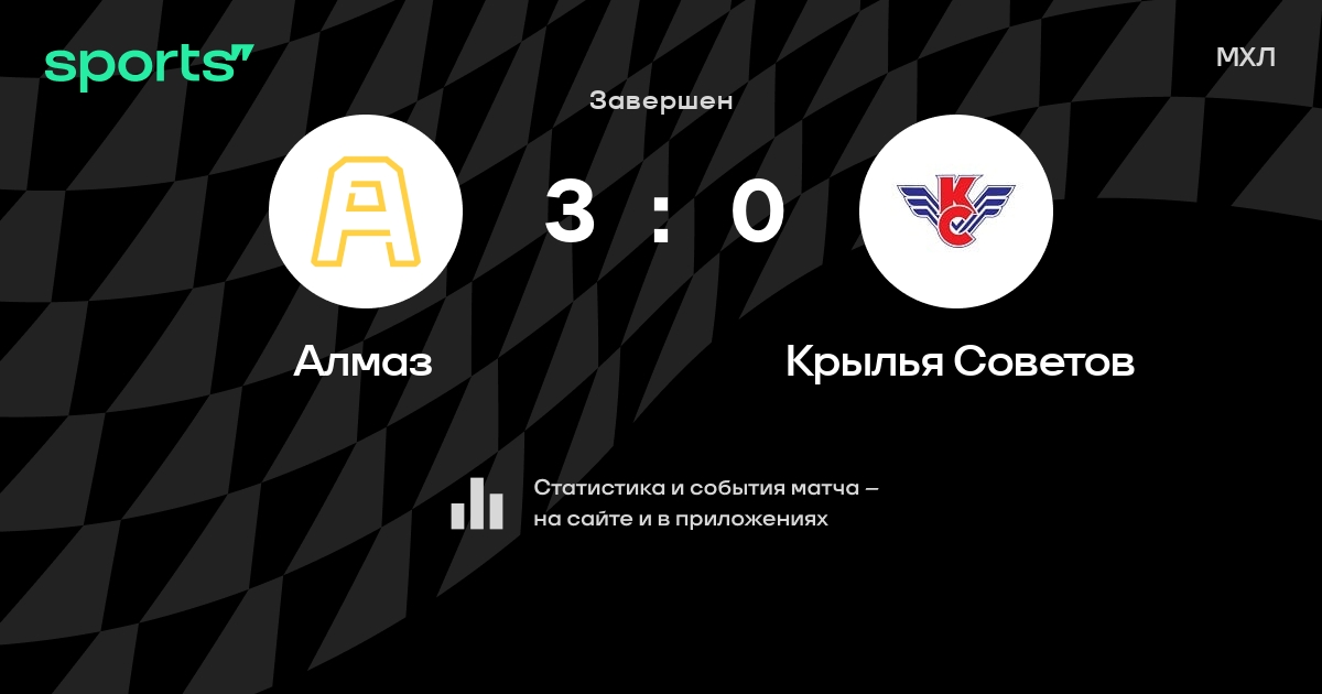 В прошедшем матче в рамках турнира МХЛ состоялась встреча команд Алмаз - Крылья Советов со счетом 3 : 0.
