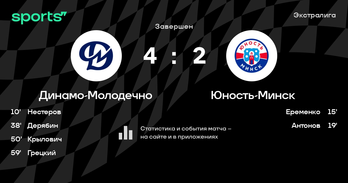 В прошедшем матче в рамках турнира Экстралига состоялась встреча команд Динамо-Молодечно - Юность-Минск в городе Молодечно (Беларусь) на стадионе Ледовый дворец Молодечно (вместимость - 2000)