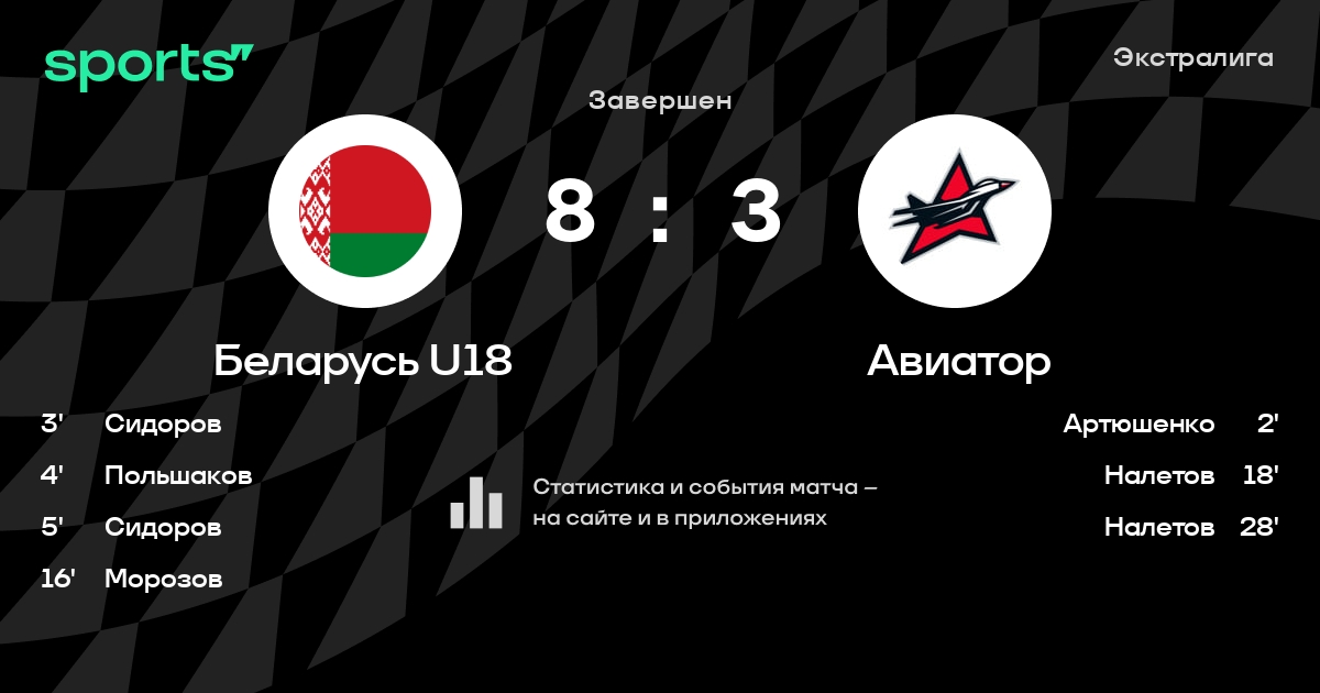 В прошедшем матче в рамках турнира Экстралига состоялась встреча команд Беларусь U18 - Авиатор в городе Острошицкий Городок (Беларусь) на стадионе Ледовая арена Раубичи (вместимость - 120)