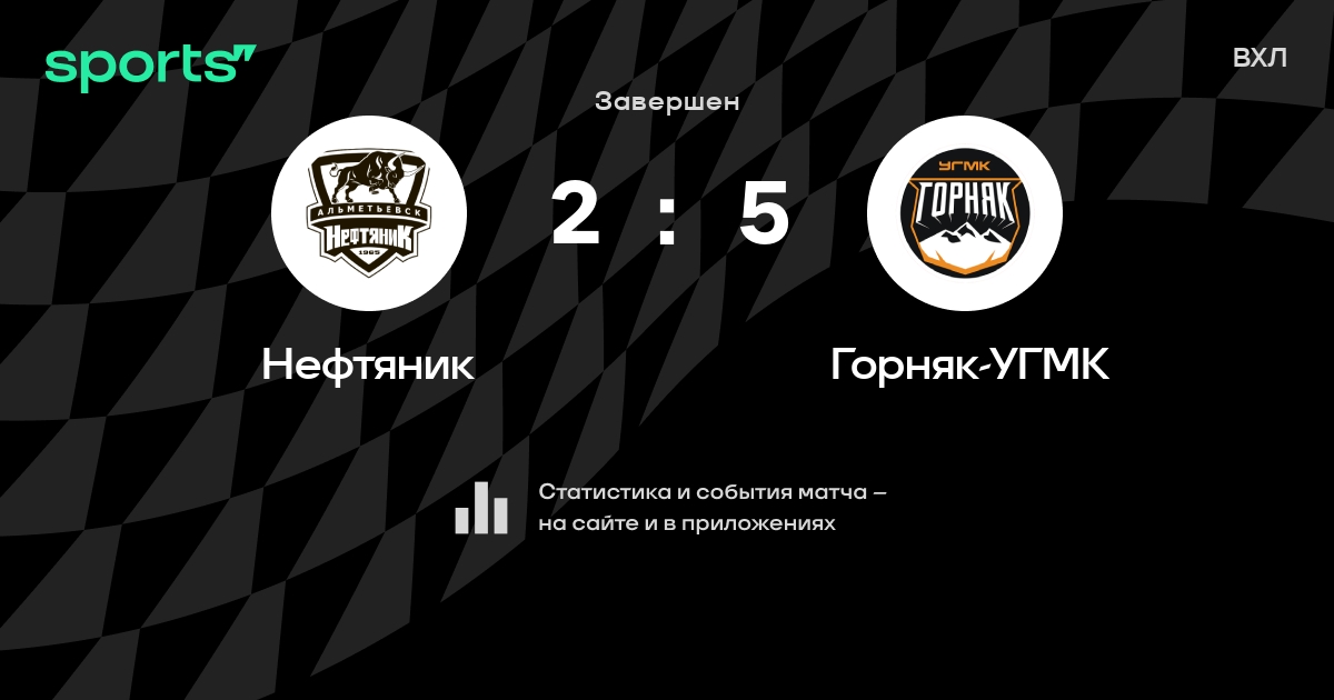 В прошедшем матче в рамках турнира ВХЛ состоялась встреча команд Нефтяник - Горняк-УГМК со счетом 2 : 5.