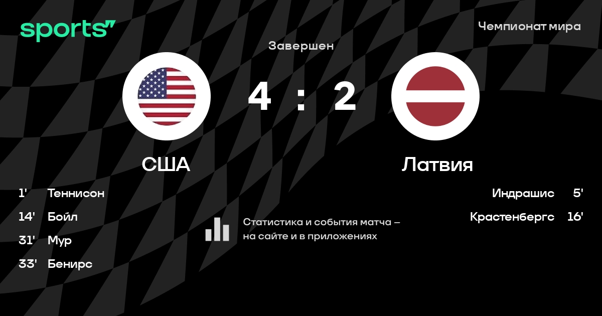 В прошедшем матче в рамках турнира Чемпионат мира Группа B состоялась встреча команд США - Латвия в городе Рига (Латвия) на стадионе Арена-Рига (вместимость - 12500)