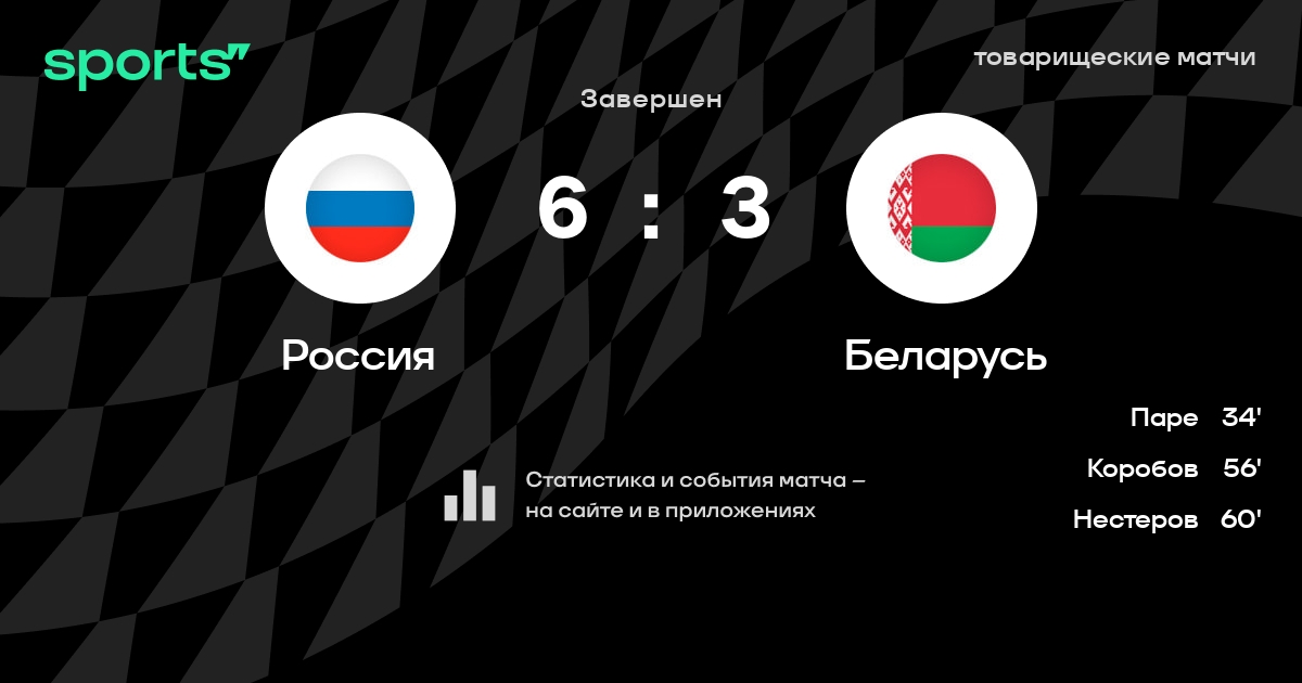 В прошедшем матче в рамках турнира товарищеские матчи состоялась встреча команд Россия - Беларусь в городе Москва (Россия) на стадионе ВТБ-Арена со счетом 6 : 3.