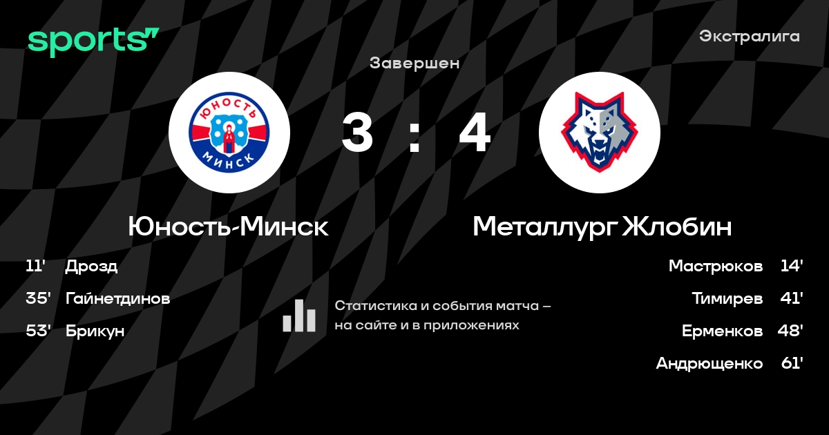 В прошедшем матче в рамках турнира Экстралига состоялась встреча команд Юность-Минск - Металлург Жлобин в городе Минск (Беларусь) на стадионе Чижовка-Арена (вместимость - 9487)