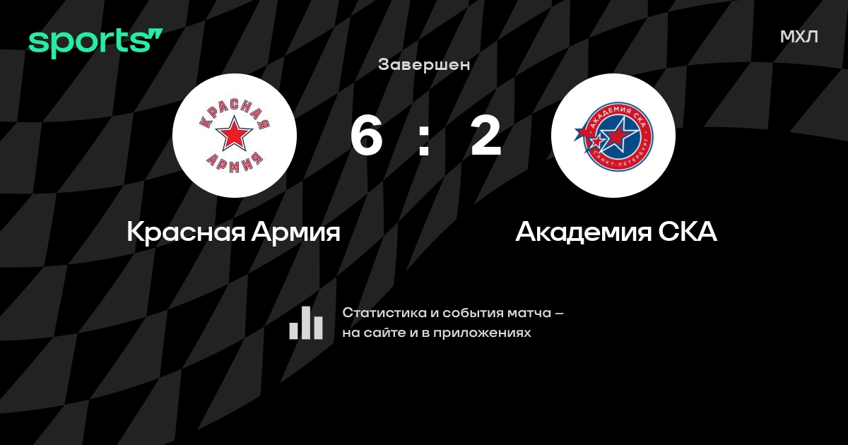 В прошедшем матче в рамках турнира МХЛ состоялась встреча команд Красная Армия - Академия СКА в городе Москва (Россия) на стадионе ЦСКА-Арена со счетом 6 : 2.
