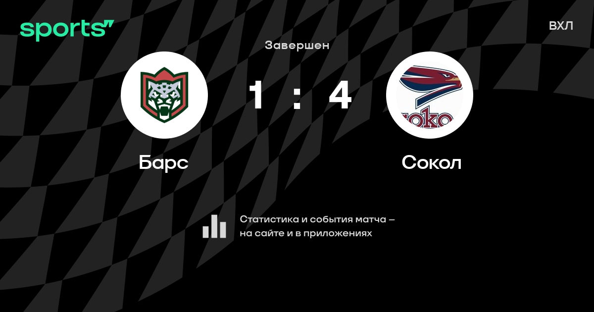 В прошедшем матче в рамках турнира ВХЛ состоялась встреча команд Барс - Сокол в городе Казань (Россия) на стадионе Дворец спорта (вместимость - 3523) со счетом 1 : 4.