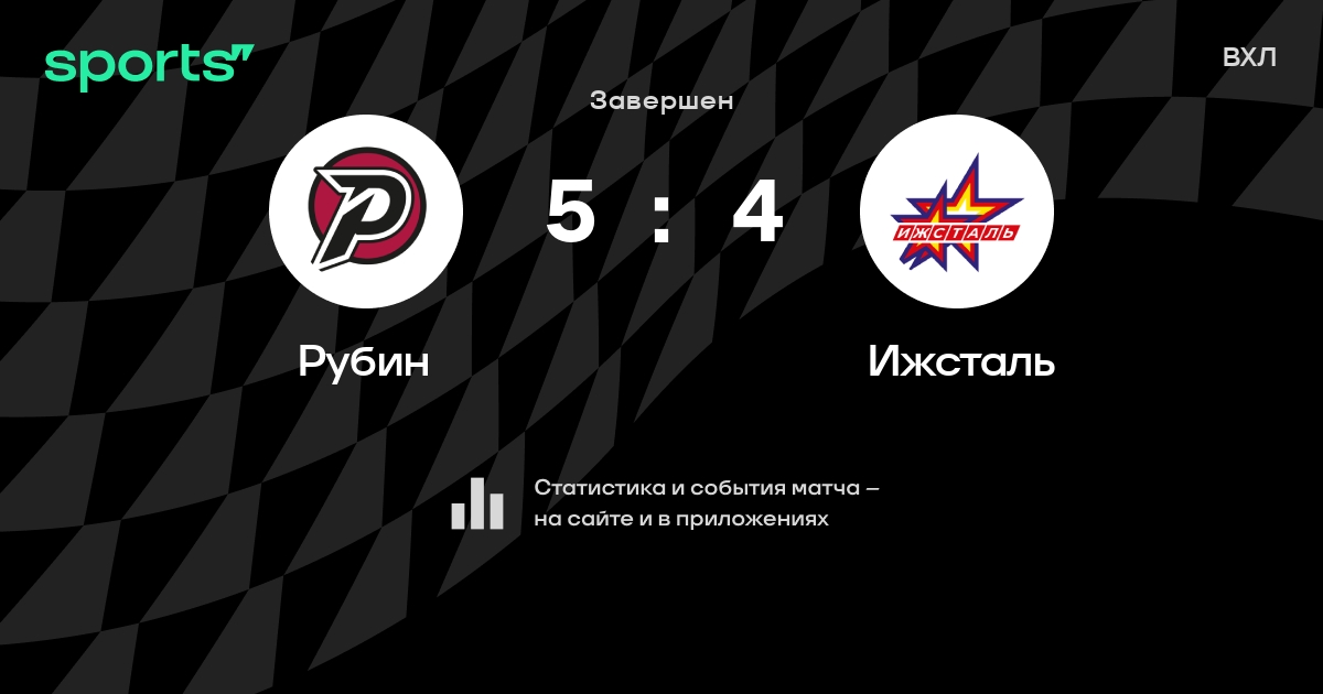В прошедшем матче в рамках турнира ВХЛ состоялась встреча команд Рубин - Ижсталь в городе Казань (Россия) на стадионе Дворец спорта (вместимость - 3523) со счетом 5 : 4.