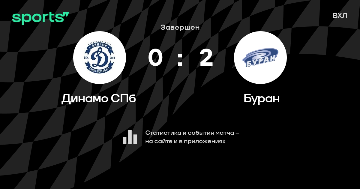 В прошедшем матче в рамках турнира ВХЛ состоялась встреча команд Динамо СПб - Буран в городе на стадионе Yubileyny Sports Palace со счетом 0 : 2.