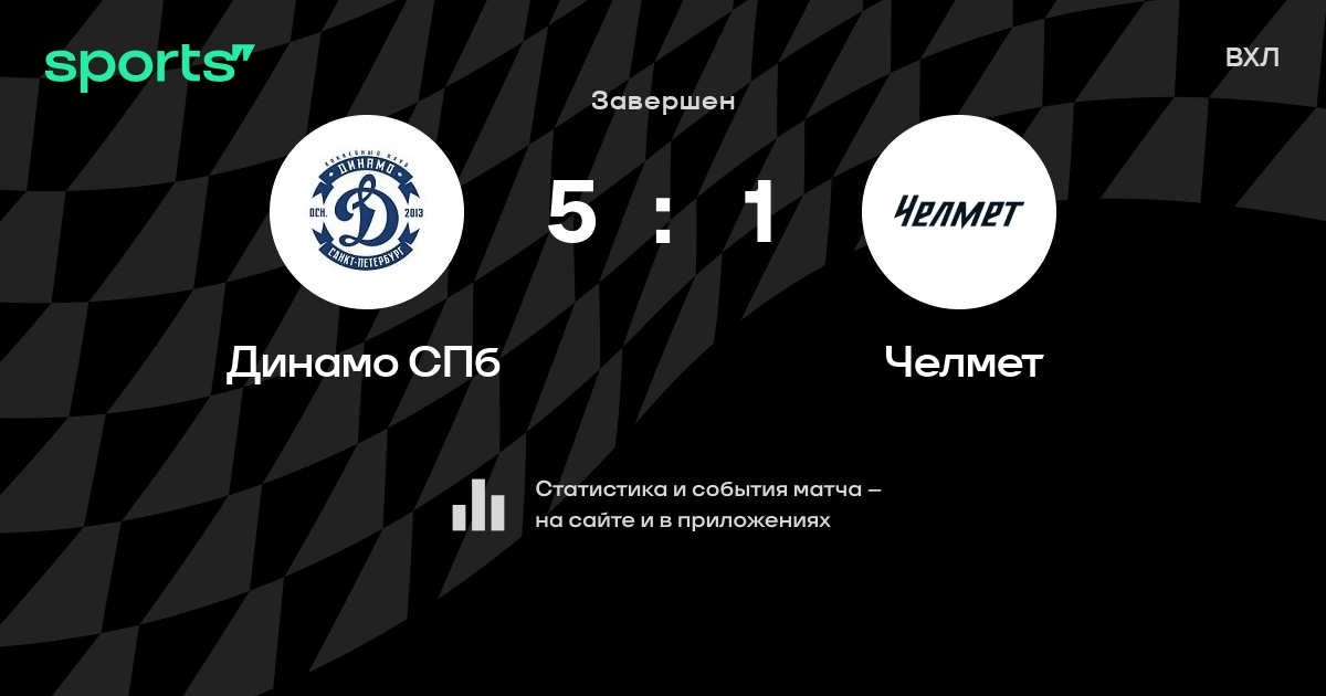 В прошедшем матче в рамках турнира ВХЛ состоялась встреча команд Динамо СПб - Челмет в городе на стадионе Yubileyny Sports Palace со счетом 5 : 1.