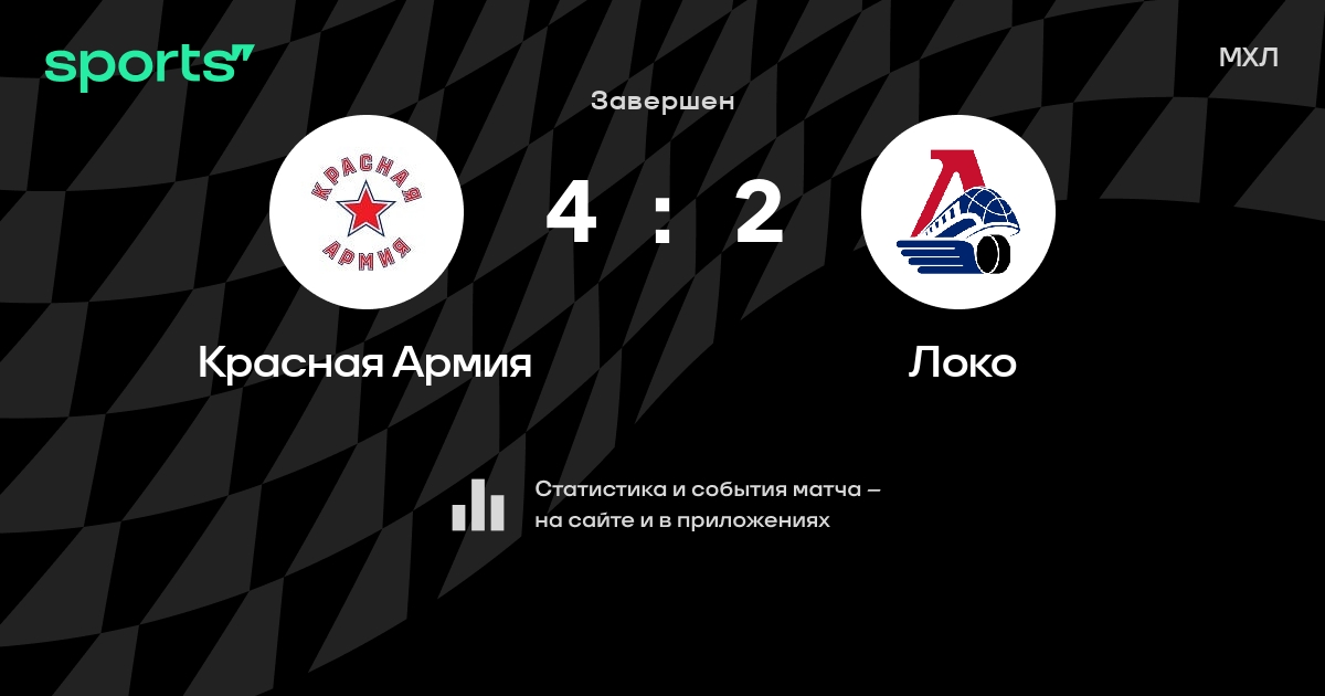 В прошедшем матче в рамках турнира МХЛ состоялась встреча команд Красная Армия - Локо в городе Москва (Россия) на стадионе ЦСКА-Арена со счетом 4 : 2.