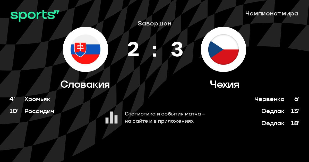 В прошедшем матче в рамках турнира Чемпионат мира Группа B состоялась встреча команд Словакия - Чехия в городе Рига (Латвия) на стадионе Арена-Рига (вместимость - 12500)