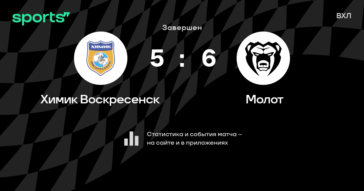 В прошедшем матче в рамках турнира ВХЛ состоялась встреча команд Химик Воскресенск - Молот в городе на стадионе Podmoskovie Ice Palace со счетом 5 : 6.