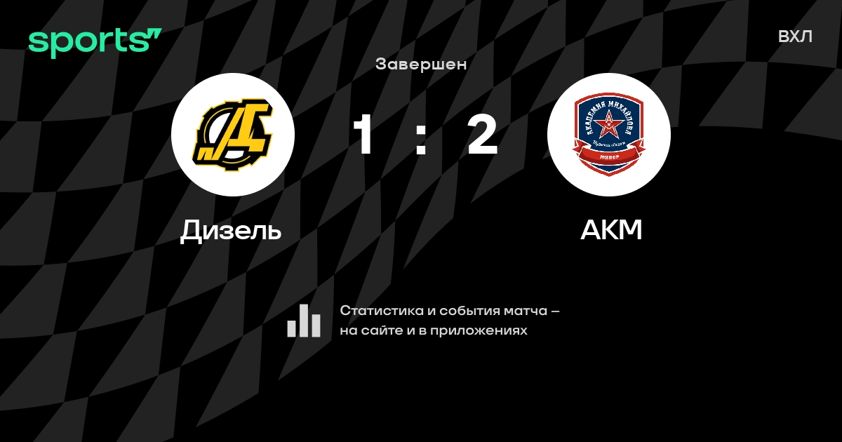 В прошедшем матче в рамках турнира ВХЛ состоялась встреча команд Дизель - АКМ в городе на стадионе Diesel-Arena со счетом 1 : 2.