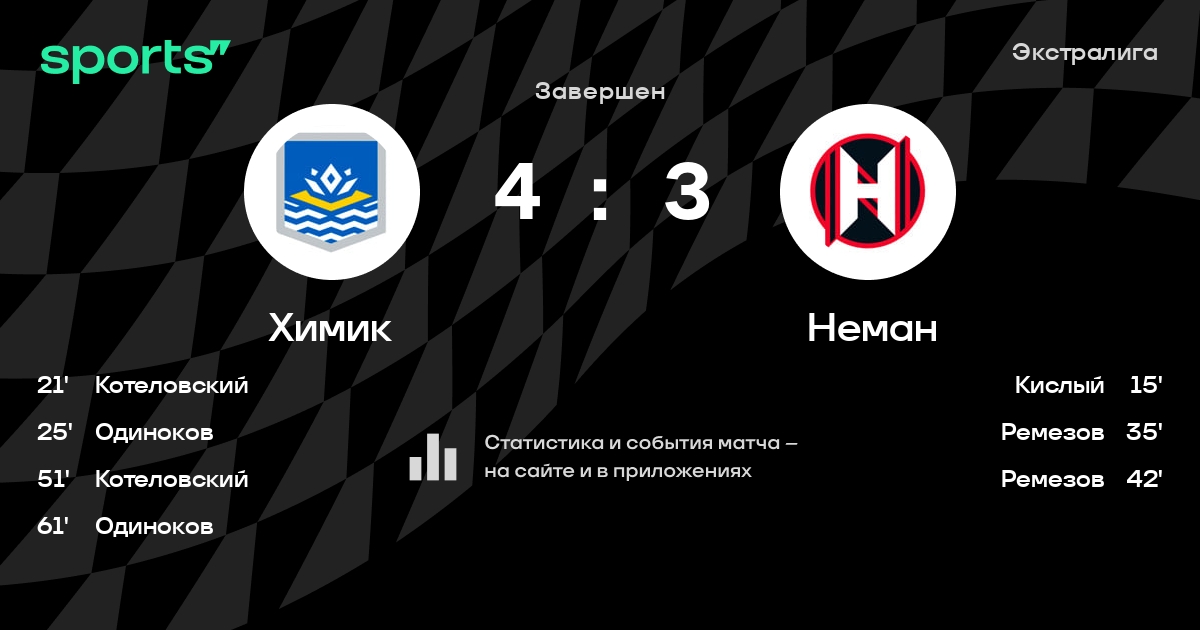 В прошедшем матче в рамках турнира Экстралига состоялась встреча команд Химик - Неман в городе Новополоцк (Беларусь) на стадионе Дворец культуры и спорта (вместимость - 1200)